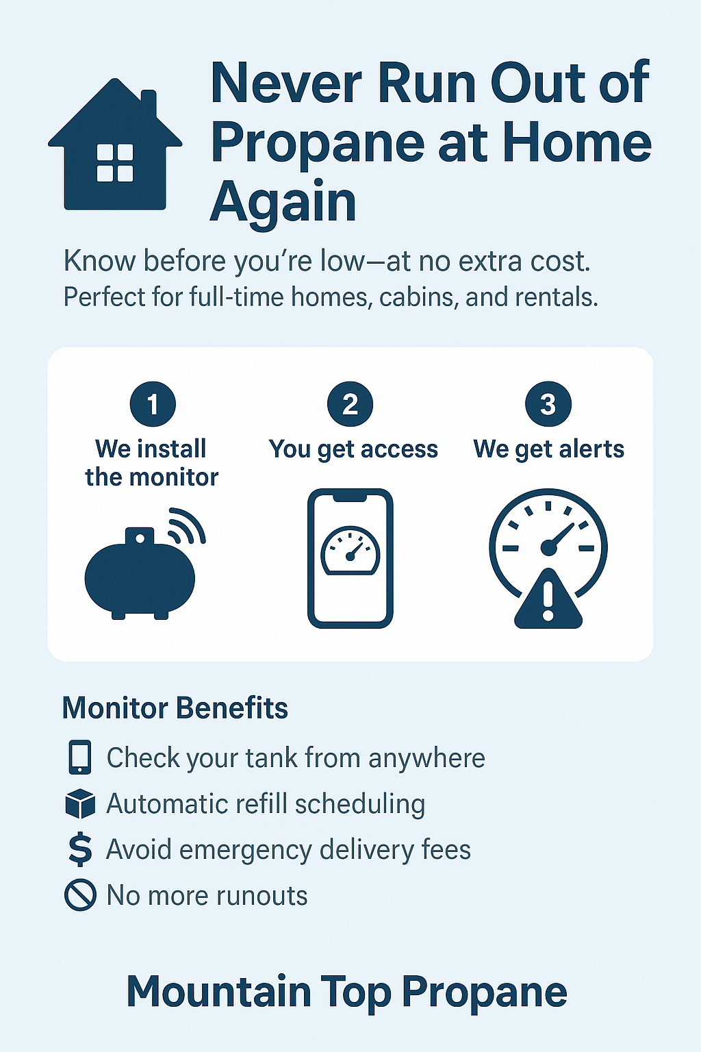 Keeping your home warm, your water hot, and your appliances running shouldn’t be a guessing game. That’s why Mountain Top Propane offers free remote tank monitoring with most residential accounts—so you always know your propane level, even when you’re not home.